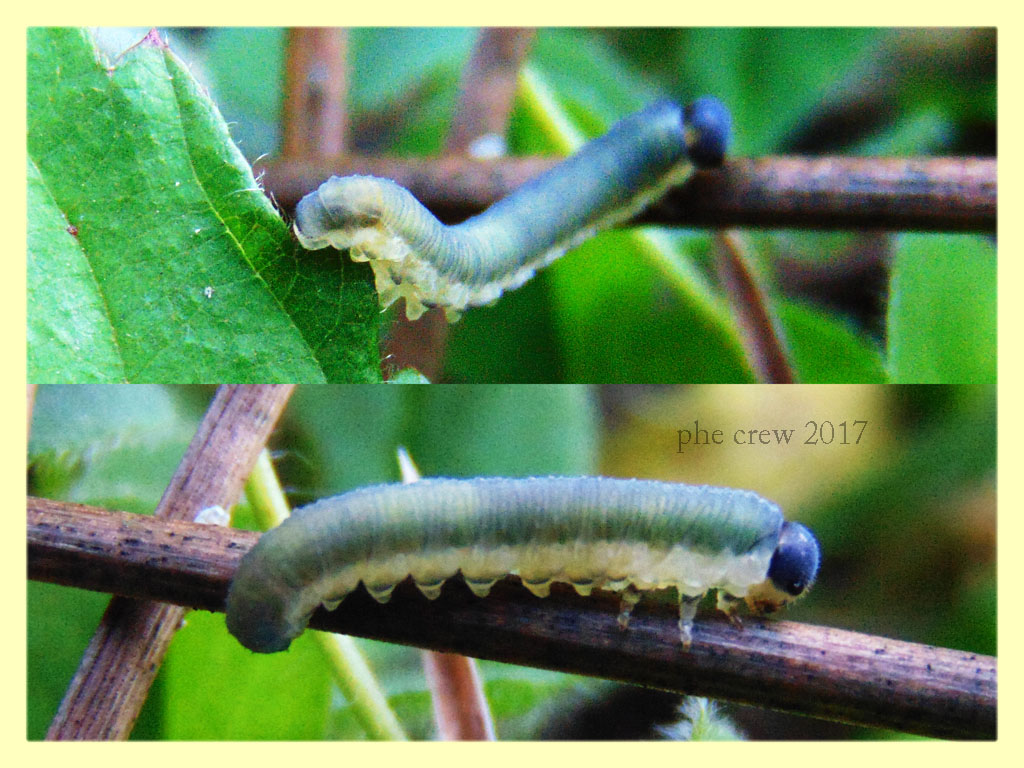 ...da una veloce ricerca su internet sembrerebbe una larva di Imenottero Tenthredinidae. La sua misura si aggirava sui 15~18 mm. La pianta ospite sembra un Rubus sp.