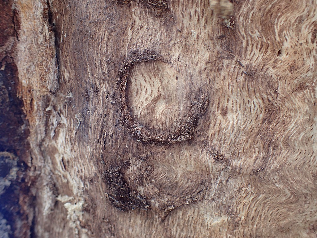 Oggi ho trovato una grossa quercia quasi completamente morta. Sulla superficie del legno di una parte del tronco scortecciata da tempo ho osservato numerose strane strutture circolari, costituite da una parete di rosura che in origine doveva stare nello spazio tra legno e corteccia. Coprivano un'area di circa 50x30 cm. Ogni singola struttura circolare misurava sui 2,5 - 3 cm di diametro.