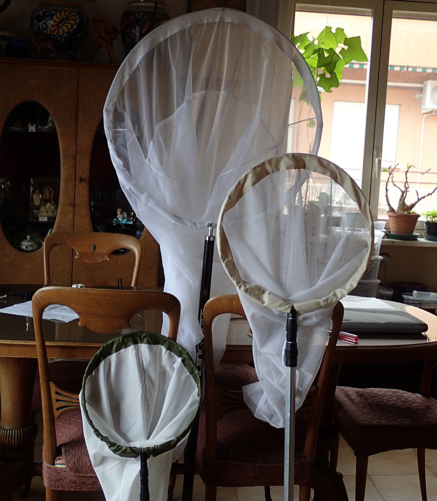 Un po' più difficile sarà destreggiarsi con il manico telescopico più corto da chiuso e più lungo da esteso, perché gli ultimi pezzi in alto sono piuttosto sottili e flessibili. Penso che su quel manico monterò il retino da 45 cm americano. Tanto che il cilindretto di alluminio del terminale che ho fissato sul manico (in origine una canna da pesca in 11 pezzi, a cui ho tolto i tre più piccoli), ha la filettatura da 8 mm, così come il cerchio in metallo da 45 cm per il sacco americano di Bioquip, che mi sono fatto arrivare direttamente dalla Cina. Mentre il cerchio da 65 cm di Entosphinx è con la filettatura da 6 mm, come tutti i retini entomologici nati come tali in commercio negli ultimi anni (per chi non ci avesse mai fatto caso, i retini entomologici attuali con attacco cerchio/manico a vite hanno una filettatura da 6 mm, i guadini da pesca con attacco dello stesso tipo hanno attacchi diversi: quelli standard da 8 mm, quelli più robusti, ormai non più in commercio, da 10 mm, ed a volte se ne trovano fuori standard da 3/8", ovvero da circa 9,5 mm). Attualmente ho rinnovato la mia dotazione di retini, per cui, tra vecchi e nuovi, ora ne ho da 6, 8 e 10 mm. Per fortuna ho trovato in vendita (sempre dai cinesi di Ebay) dei raccordi in aluminio per passare il diametro della filettatura da una misura all'altra. Il manico relescopico da 4 metri, invece, l'avevo comprato perché mi era stato detto che aveva un attacco da 8 mm, invece era da 3/8", ed ho dovuto comprare una punta da filettatrice per allargarlo a 10 mm (infatti in foto si vede che tra cerchio e manico del retino più grande ci sono due cilindretti, che sono due adattatori 10-8 e 8-6 mm).