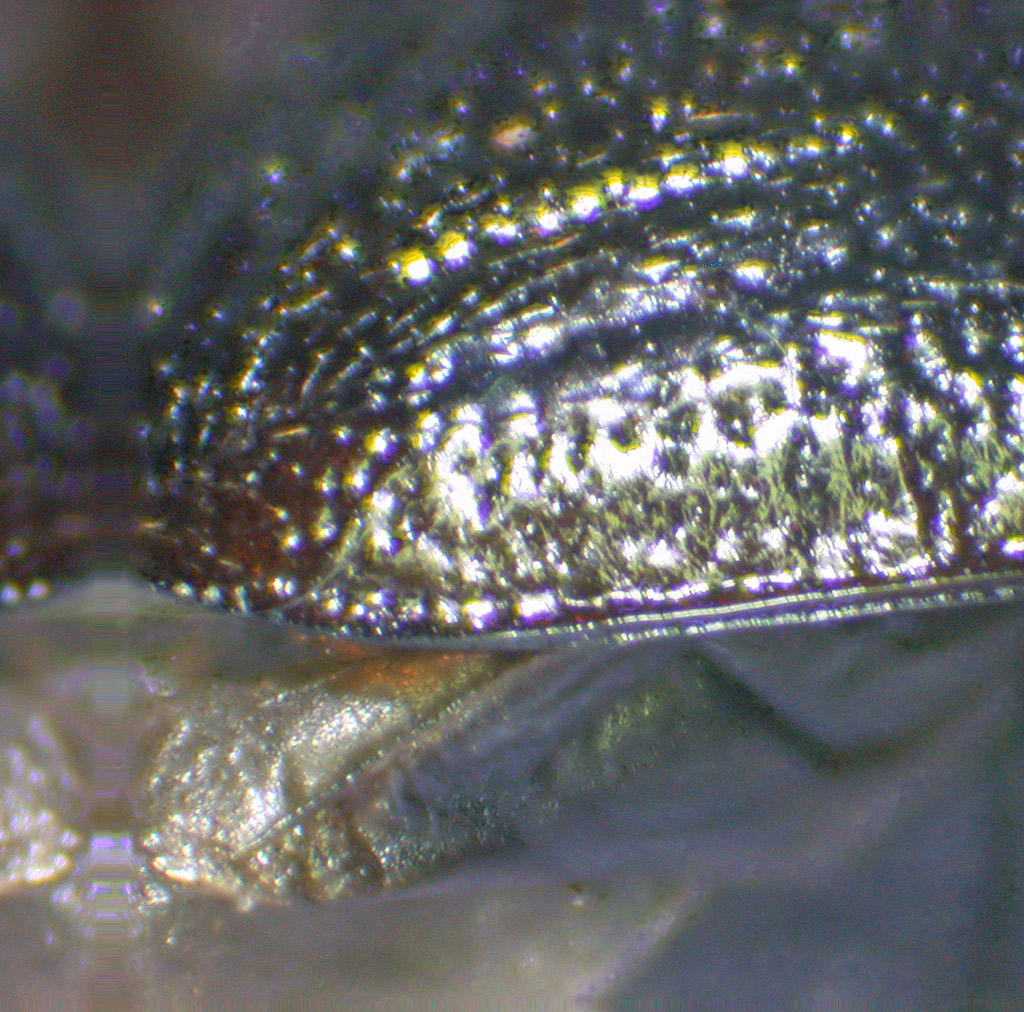 Allora, ho fatto la foto dell'intero bordo dell'elitra al microscopio. Per ottenere l'intero profilo, ho fatto tre inquadrature sequenziali, ognuno in scatto multiplo e successivo stacking, e poi ho ricomposto l'intera elitra. C'è qualche "sbavatura" di fusione files, ma tutto sommato la immaginavo più difficile. Secondo me, comunque, la doppia plicatura delle epipleure non è più visibile dal punto indicato dalla freccia.