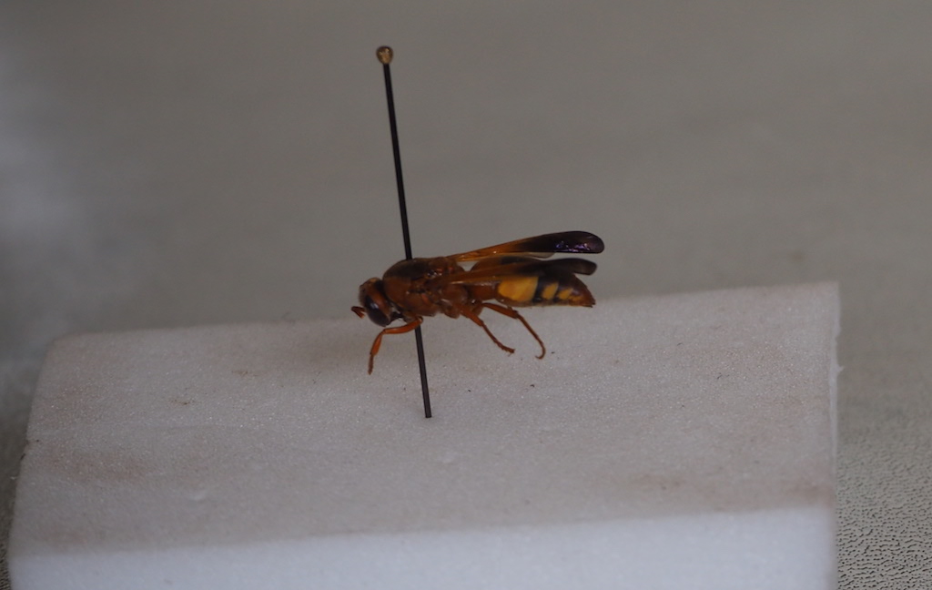 Ho ritrovato questo Imenottero risalente al luglio dell'anno scorso... Vi racconto la storia: l'anno scorso, d'estate, ero in casa quando è entrato un rumoroso insetto: inizialmente credevo fosse un semplice calabrone, ma catturandolo mi accorsi che era strano, aveva colorazioni diverse da Vespa crabro... allora lo cacciai in freezer e, successivamente, lo preparai. Poco dopo tornai a Bologna, dove abito, e quasi me ne dimenticai totalmente... Oggi l'ho ritrovato e ho cercato su internet che vespa potesse essere, e l'unico genere che ho individuato che mi è sembrato compatibile è quello dei Cryptocheilus, i cui appartenenti rispetto al mio individuo hanno simile la colorazione delle ali e del corpo che è piuttosto arancione, ma l'addome però è differente da tutte le specie di questo genere che sono riuscito a trovare (ma non si esclude assolutamente che il genere sia giusto e che io abbia sbagliato). Dal momento che di imenotteri so ancora meno di quanto so degli altri insetti mi rivolgo a voi, sapete dirmi che specie è?