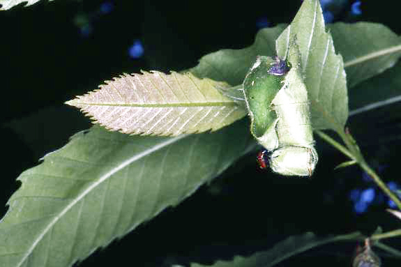 In quegli anni cominciavo anche a documentare i comportamenti dei sigarai. Senza aver presente l'articolo in questione, capitò che una delle prime popolazioni che osservai fosse proprio di Attelabus nitens, e proprio su castagno (nei quasi quarant'anni successivi mi è capitato raramente di osservarlo su tale pianta). Con i limitati mezzi che avevo a disposizione, nell'estate del 1984 fotografai, nei dintorni di Levico (TN), una coppia intenta a costruire un barilotto. Abbiate pazienza per la qualità delle immagini: sono diapositive, già non eccerzionali, scansionate dopo tanto tempo; archeologia entomologica.