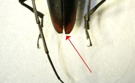 Ecco una foto, non molto ingrandita ma credo sufficiente, per indicarti la spina dell'apice elitrale del cerdo; in pratica è una punta all'apice interno dell'elitra. Perché non la vedi?
