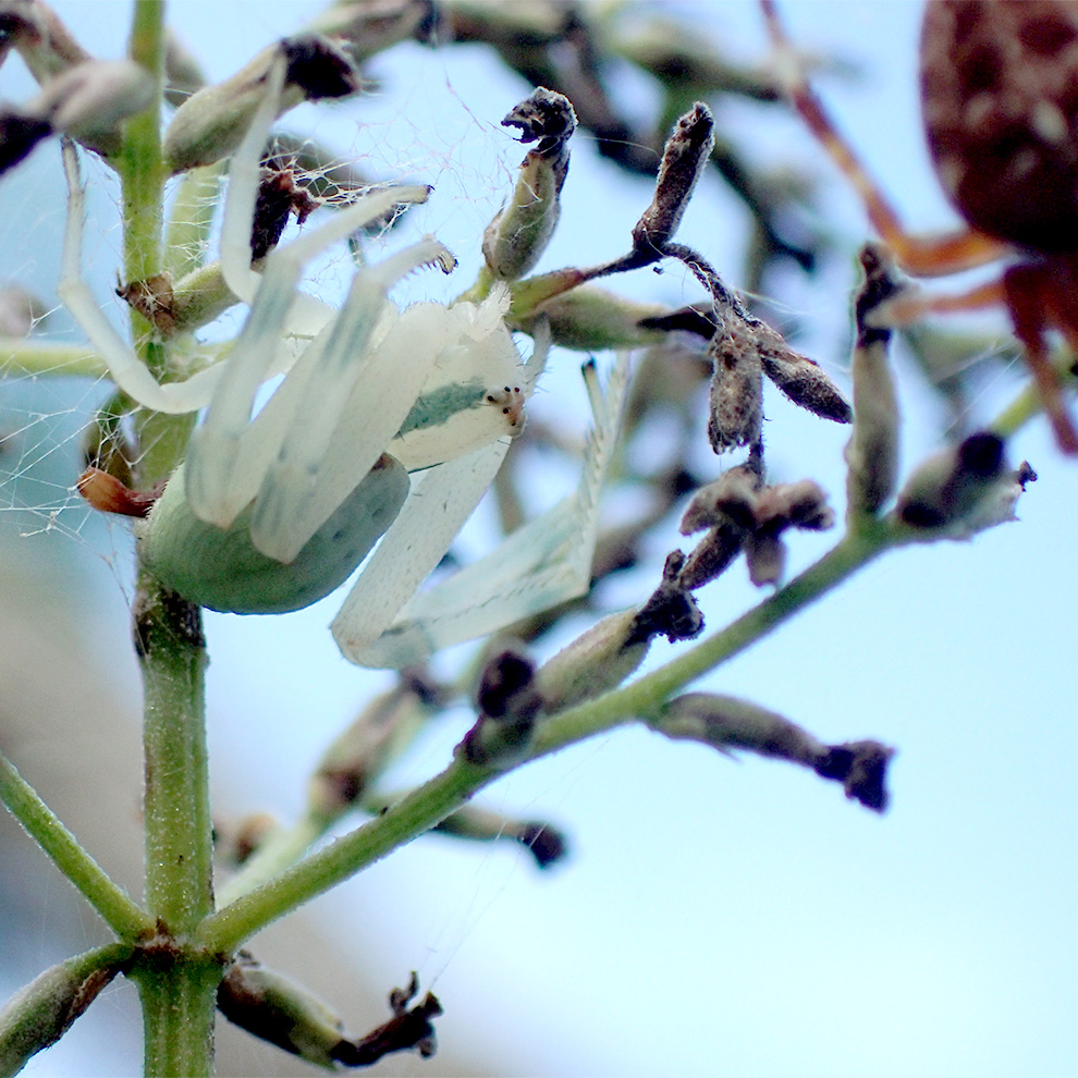 Stavo fotografando un ragnetto (se non erro un' Araneus diadematus) in bella mostra al centro della sua tela. Purtroppo mi sono avvicinato troppo ed immediatamente è scappato via a cercare riparo tra i rametti della pianta (bassa) a cui era fissata la tela.. velocemente continua ad arrampicarsi.. fino a trovare un "caloroso abbraccio" di benvenuto!!