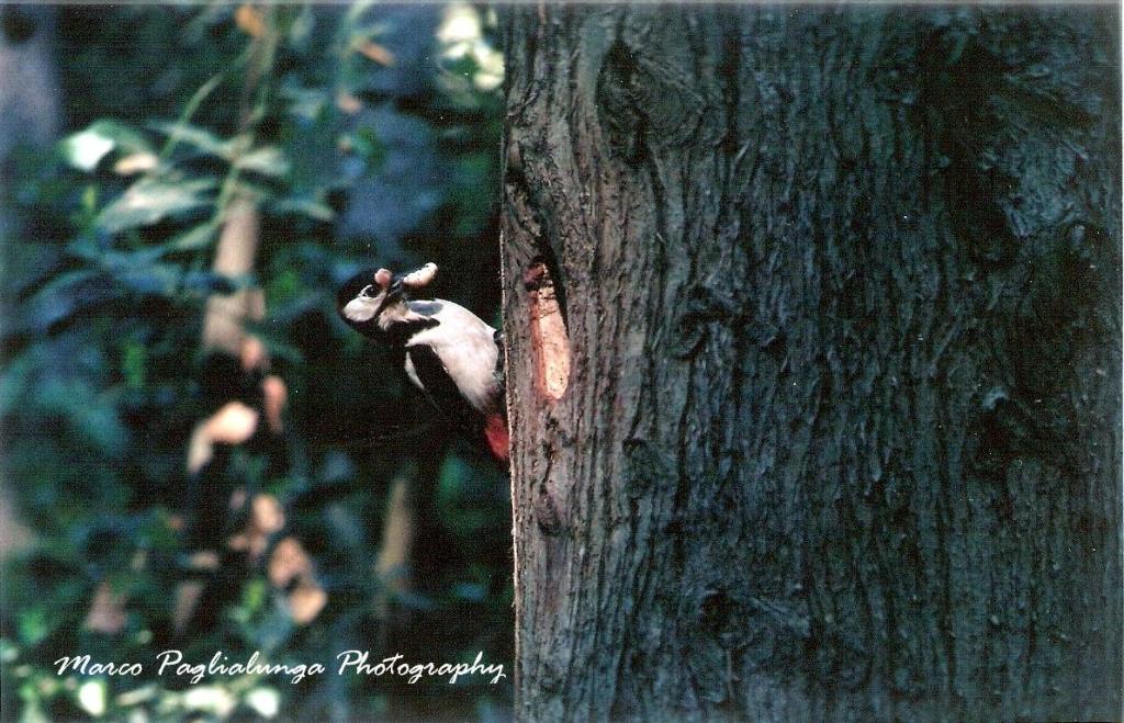 Circa 10 min e niente,inizio a pensare che sia troppo sospettoso,io sono praticamente in un silenzio tombale e fermo come una roccia.All'improvviso sento e intravedo,da sotto il telo(l'unico buco è quello per il teleobbiettivo della macchina fotografica)uno sfarfallio di ali.E' lui!!Un maschio di Picchio rosso maggiore (Dendrocopos major) con una macchia rosso fuoco nella nuca.Bellissimo.Si è agganciato al cipresso dal lato opposto e adesso stà girando davanti a me,a portata del mio campo visivo,sotto il buco del nido.I piccoli l'hanno già sentito e sono in fermento,ma lui aspetta guarda in alto,in basso,a destra,a sinistra,solo quando si sente sicuro,inizia a imbeccare.Due,tre,quattro volte dentro e fuori...ma quante bocche ci saranno lì dentro?(da 4 a 7 uova ho letto).Dopodichè entra e dopo qualche secondo si affaccia con nel becco gli escrementi dei suoi cari pullus e parte come un fulmine.