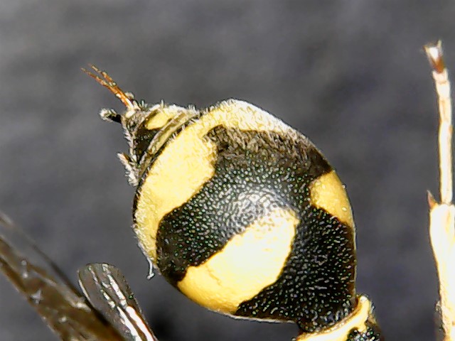 Per quanto riguarda la retrazione dei segmenti addominali, si può risolvere tirando un po' l'addome con le pinzette una volta messo in posa l'insetto, prima che si secchi. Ma comunque quella parte dell'addome solitamente non presenta caratteri importanti per gli Eumenes.