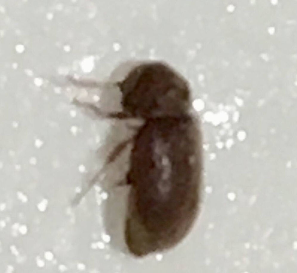 Soprattutto grazie a quest'ultima foto, ma anche sulla base delle informazioni anche dimensionali fornite, l'insetto può forse essere identificabile come 'tarlo del pane', cioè il comune Stegobium paniceum (Anobiidi), coleottero cosmopolita dannoso a derrate alimentari vegetali secche, compatte o anche polverose e incoerenti come la farina, nelle quali la larva può svilupparsi; ma in realtà capace di comportarsi anche come vero e proprio tarlo del legno, scavando come larva gallerie per nutrirsi di legno, soprattutto legno tenero. Non sono risparmiati neppure i libri vecchi o antichi, nei quali le larve possono pure scavare gallerie che non di rado danneggiano gravemente le pagine. A parte questi aspetti di possibile dannosità (consumo e inquinamento di derrate, danni a mobilio, infissi, patrimonio culturale), questo Anobiide non comporta rischi d'altro genere per l'uomo. Le zampe, come generalmente in ogni insetto adulto, in questo caso sono sicuramente sei.