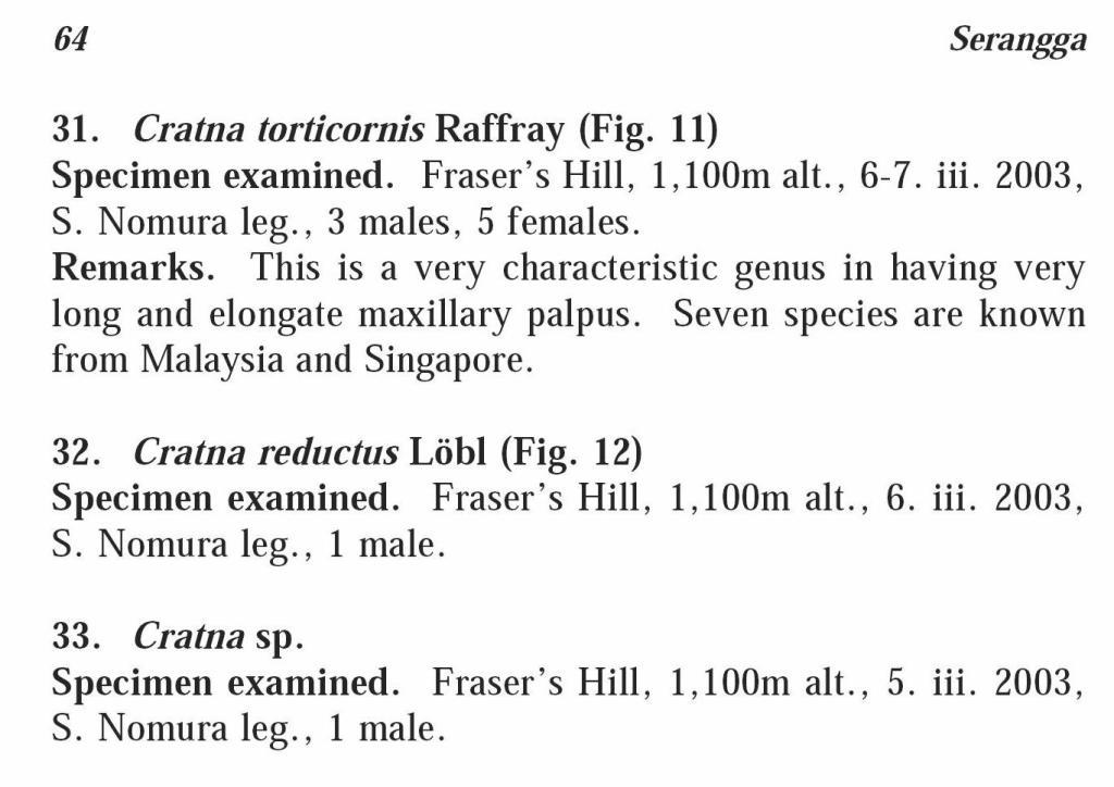 Cratna torticornis Raffray, 1890................Malaysia and Singapore