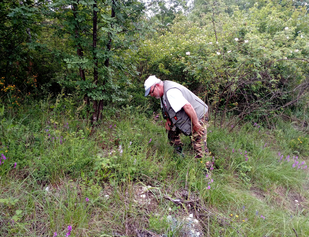 riprendo una discussione su questo non comune cerambicide, discussione iniziata da un post di Conan del 18.VI.2012 su questo forum e rimasta un pò in sospeso. La primavera scorsa ho avuto modo di ritrovare la bestiola e di scattare qualche pessima foto col cellulare della pianta ospite, Lithospermum purpureo-coeruleum, pianta alta circa 30/40 cm. dai piccoli fiori azzurri a forma di calice e dalle foglie lunghe e lanceolate. Poche le piante con i fiori rispetto a quelle presenti sul terreno che formano spesso dei veri tappeti erbosi. Nella foto dell'habitat (margine di boscaglia mista vicino alla strada) compare anche l'amico entomologo Adriano Migliorini che mi ha aiutato nella ricerca e che ringrazio.