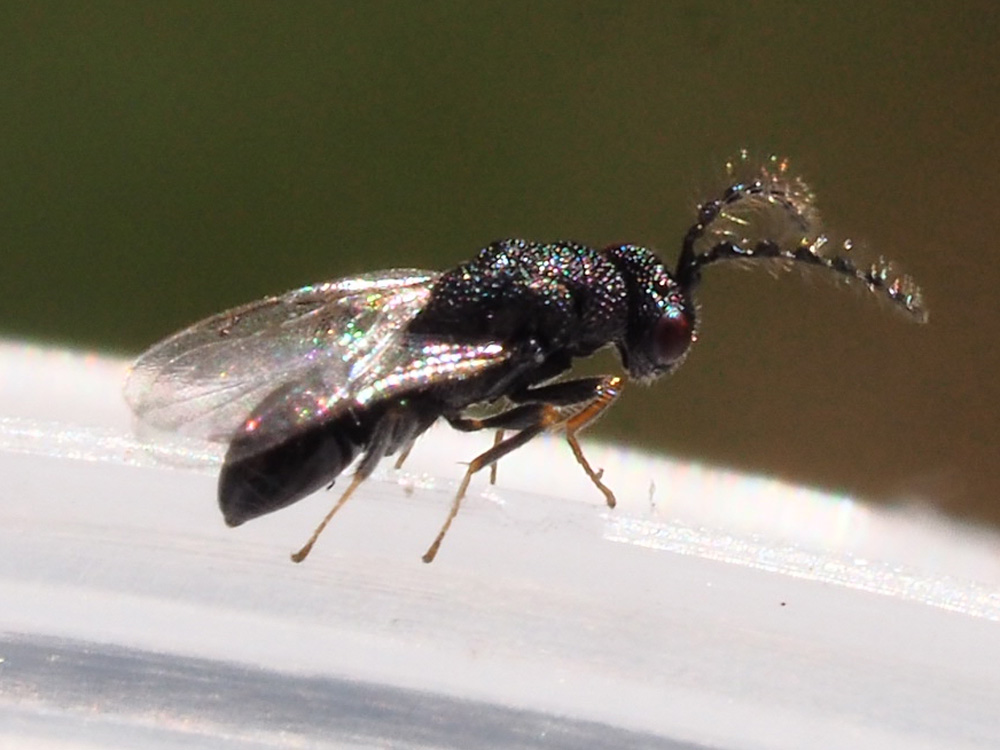 Presumo si tratti di maschio di Eurytoma sp. Molto simile a Eurytoma brunniventris Ratzeburg, 1852 che parassita numerose specie di galle di quercia, compreso Andricus, ma che ancora non è stato rilavato in Italia (?). Non so con sicurezza se si trovava in Andricus quercuscalicis (Burgsdorff, 1783) o in in Andricus aries (Giraud, 1859) Le due galle,infatti, erano contenute nella scatola in cui si è sviluppato l’insetto.