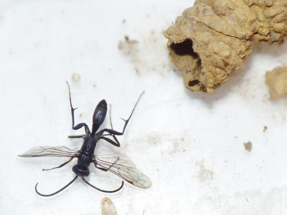 Si vede effettivamente un piccolo Pompilidae nero e un Ichneumonidae parassitoide di un'altra celletta.