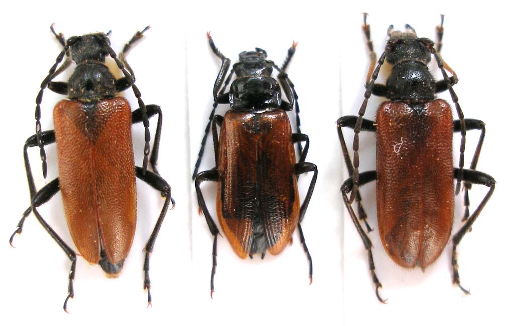 Quello al centro è effettivamente un Alleculide, genere Omophlus, che si raccoglie molto spesso in associazione con le Cortodera, almeno in Turchia e in Iran. Questa somiglianza ha dato origine al nome di un paio di specie di Cortodera: C. pseudomophlus appunto e C. omophloides Holzschuh, 1975. Sembra un tipico caso di mimetismo batesiano, in cui Cortodera, che condivide l'habitat con Omophlus, ne sfrutta la colorazione. Non so, però, se Omophlus abbia tessuti più o meno indigesti e se, quindi, si tratti di una colorazione aposematica o se la somiglianza fra i due generi sia solo un fenomeno di convergenza evolutiva. C'è anche da dire che un terzo soggetto condivide il tipo di colorazione, l'habitat e, spesso, gli stessi fiori, con i due precedenti. Si tratta di un Meloide, probabilmente un Lydus, questo sì, certamente e notoriamente, indigesto e che, magari, serve da modello ad entrambi.