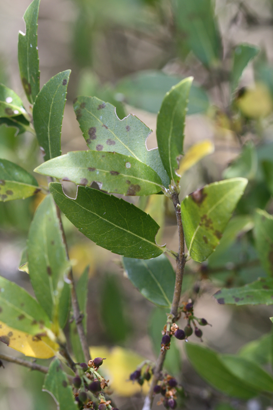 La foto inganna altri hanno detto corbezzolo ! Questa pianta ha piccole bacche rosse raggruppate agli apici dei rami , non ricordo se poi diventano nere .Le foglie sono lanceate molto piccole simili a quelle dell' ulivo ma meno cerose
