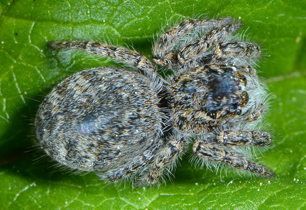 Grosso Salticidae (grosso non come ragno in generale, ma come Salticidae naturalmente) lungo circa 8-9 mm. E' grigiastro con sfumature azzurre, invece che brunastro con sfumature rossicce come al solito, ma mi sembra lo stesso una femmina di Philaeus chrysops (Poda, 1761).