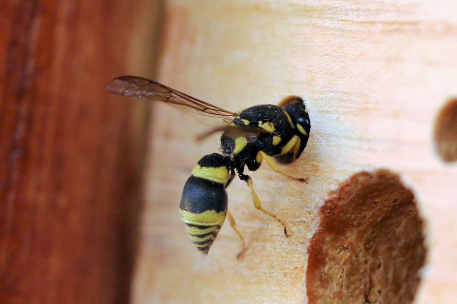 E' dal 13 giugno che questa vespina frequenta i miei "hotel" per api. E' possibile identificarla?
