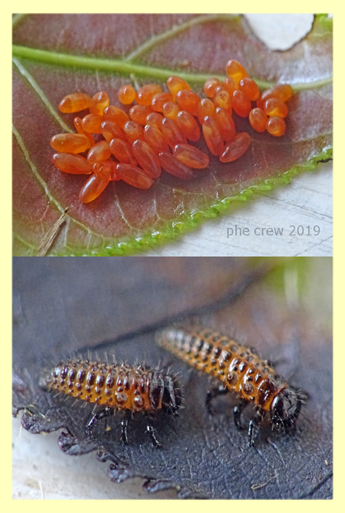 ...te lo dico con sicurezza e' un crisomelide con le elitre rosse che incontro tutti gli anni nello stesso posto. Pero' quest' anno dato che ho visto anche il gruppetto di uova ho deciso di fotografare tutto il ciclo. Poi pero' cercando qualche migliore soluzione per l' allevamento su internet mi sono accorto che forse quella comune C. populi che osservavo ogni anno puo darsi che non sia lei.....