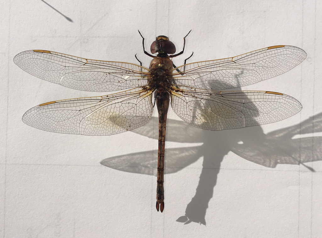 Ciao. Dovrebbe essere una Anax ephippiger (Burmeister, 1839) - Aeshnidae. Se non vedo male una femmina. La forma dell'ala, con i suoi particolari, è da Anax. E così pure le appendici. I colori non aiutano molto se non l'ombreggiatura delle ali posteriori che confermerebbe l'ipotesi.