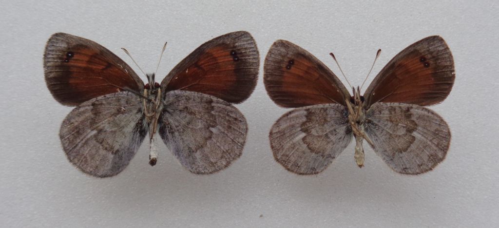 Grazie Riccardo. Trovo che non sia facile giudicare da foto così voglio mettere a confronto questa e quest'altra già postata qui viewtopic.php?f=11&t=87449 sulla quale nutro gli stessi dubbi, con un esemplare (a sx) che mi convince di più come calcaria preso sopra Piancavallo a m 1640 ca. il 13-VII-2018, più grande (ap. alare mm 38, +5 mm) e con diversa colorazione e della quale fornisco anche foto da sola. Magari si deduce meglio cosa possano essere tutte e tre le farfalle postate. La mia idea è che le due più piccole possano riferirsi a Erebia cassioides e solo questa di confronto forse a calcaria. :hi: