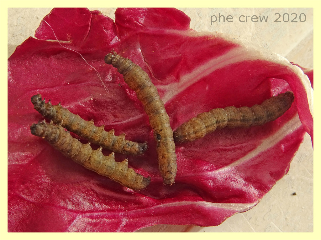 ...ad oggi, 20.11.2019, le poche larve che sono rimaste (4/5) ancora sopravvivono e hanno raggiunto i 5 mm. Sono molto lente sia nei movimenti che nella crescita ma sara' colpa delle basse temperature. Ho poi messo anche altre foglie da allora: Tarassaco, Parietaria, Plantago, Malva e altre piante nostrane ma ho notato che dal Radicchio nel cambiare dieta ci hanno messo un po, alla fine hanno assaggiato un po tutto e non ho ancora capito se la loro scelta sia il Plantago. Allego una foto di una delle larve. A presto :hi: