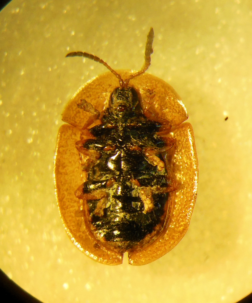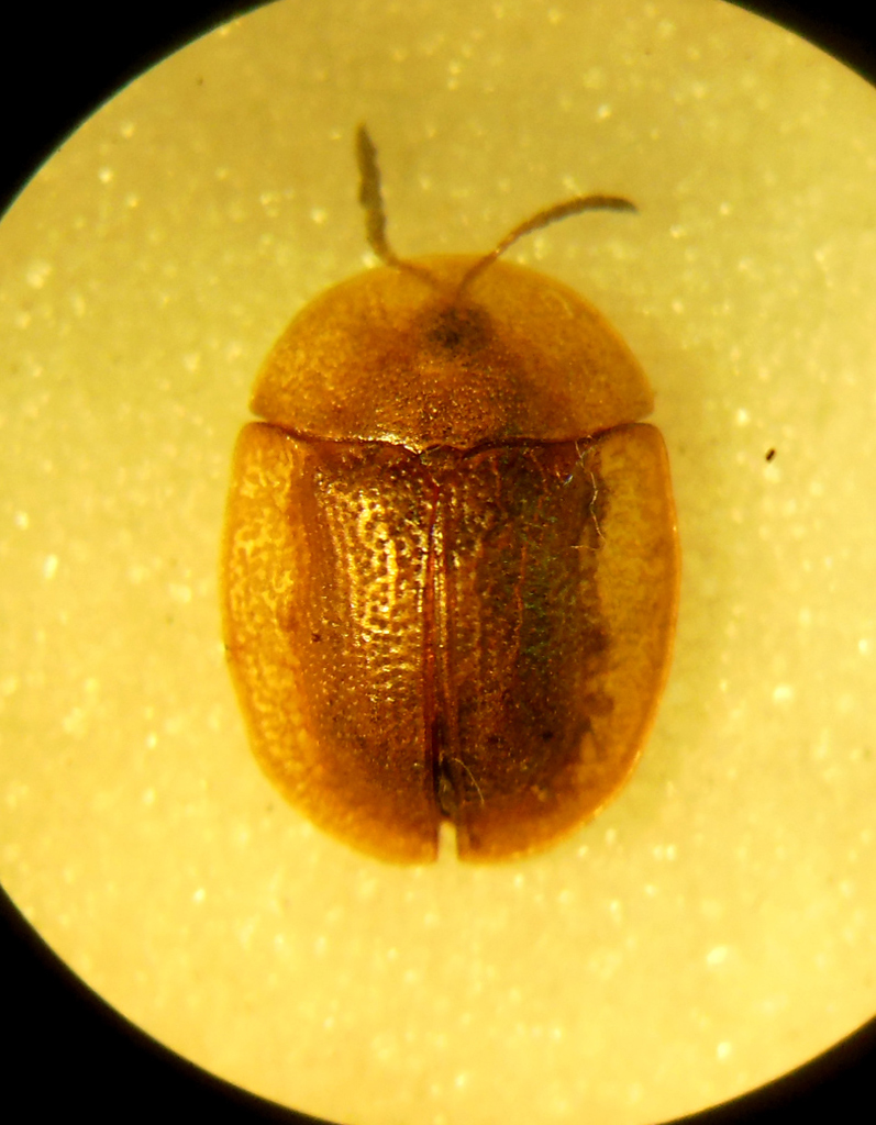 Scusa se riposto le foto con la correzione della dominante gialla; potresti verificare quanto sia rispondente al reale la "nuova" colorazione e soprattutto se si notano o no macchie più scure alla base elitrale e/o attorno allo scutello e se puoi escludere ogni accenno di coste elitrali come nelle Hypocassida? Una forma così tozza ed ovale ad ampi margini laterali spianati come pare, non ha molte opzioni, credo.