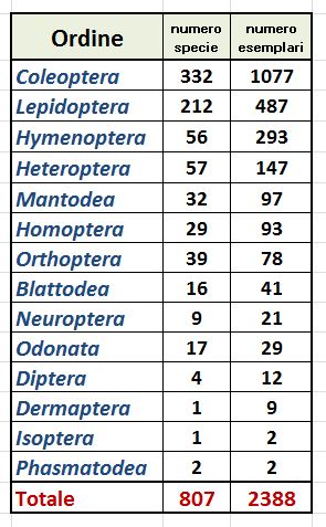 Nella tabella gli ordini sono elencati a partire da quello in cui ho raccolto più esemplari, i Coleotteri e via via a scendere tra quelli che ho raccolto di meno.