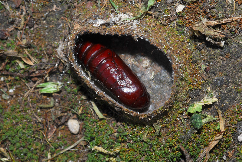 Crisalidi trovate spostando dei vasi in giardino, le crisalidi erano contenute in un bozzolo costruito tra lo spessore del fondo del vaso e il terreno. La lunghezza è di circa di 2-2,5 cm.