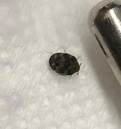 Buonasera! Mia sorella mi manda queste foto di questo piccolo coleottero che ha trovato in casa. Come vedete dalla foto con la presa, è piccolissimo; meglio di così le foto non le ho... una l'ho schiarita così si vede un po' meglio il pattern sulle elitre. Si riesce a capire qualcosa?