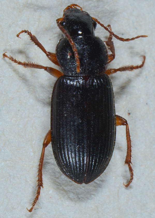 Il 24 giugno, alla luce del terrazzo accesa per attirare falene, sono arrivati fra le altre cose, numerosi Carabidae. Alcuni, che credo siano degli Harpalinae (Ophonus?) erano divisi in due gruppi di dimensioni. Una metà misuravano 7-8 mm, mentre la seconda metà misuravano 11-12 mm. i più piccoli avevano il pronoto pustulato di fitti punti depressi, mentre nei grandi i punti depressi erano confinati alla base, ed il resto del pronoto era liscio, Per il resto erano molto simili, tanto che ho pensato che potessero essere non necessariamente specie diverse, ma un'unica specie con forte dimorfismo sessuale. Questo è uno dei piccoli. Nel caso siano 2 specie distinte posto la versione grande in quest'altra discussione.