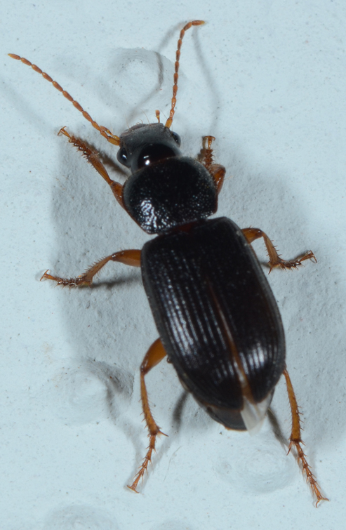 Il 24 giugno, alla luce del terrazzo accesa per attirare falene, sono arrivati fra le altre cose, numerosi Carabidae. Alcuni, che credo siano degli Harpalinae (Ophonus?) erano divisi in due gruppi di dimensioni. Una metà misuravano 7-8 mm, mentre la seconda metà misuravano 11-12 mm. i più piccoli avevano il pronoto pustulato di fitti punti depressi, mentre nei grandi i punti depressi erano confinati alla base, ed il resto del pronoto era liscio, Per il resto erano molto simili, tanto che ho pensato che potessero essere non necessariamente specie diverse, ma un'unica specie con forte dimorfismo sessuale. Questo è uno dei piccoli. Nel caso siano 2 specie distinte posto la versione grande in quest'altra discussione.