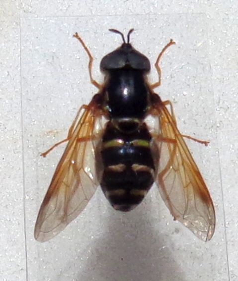Potrebbe essere un maschio di Chrysotoxum festivum (Linnaeus, 1758). Per esserne sicuri occorrerebbe una foto della parte ventrale dell'addome dove si possano apprezzare i contorni degli sterniti, una foto laterale dell'addome dove si veda il colore di tutto il margine e una foto dello scutello che consenta di valutare la lunghezza dei peli (c'è una variante delle leggi di Murphy che vale in questi casi: non importa quante foto fai per rendere possibile una determinazione, ne manca sempre qualcuna).