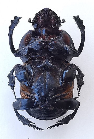 Gli Onitini, nonostante una relativa omogeneità nella forma generale del corpo, comprendono a mio modesto parere alcuni degli Scarabeidi più belli. In Asia e nel Paleartico ci sono solo 3 generi appartenenti a questa tribù, ma l'Africa ne conta ben 18, di cui 15 endemici. Heteronitis, esclusivamente africano, è un genere molto caratteristico per vari motivi: le grandi dimensioni (25-40mm, superate solo dai Megalonitis), il ricco armamentario di spine e protrusioni presenti nei maschi e, soprattutto, la grossa cresta pentagonale presente sul vertice del capo delle femmine, accompagnata da una depressione anteriore del pronoto. Le 5 specie di Heteronitis popolano le savane secche e sono probabilmente tutte associate all'elefante, ma, con la progressiva rarefazione dei pachidermi, alcune sembrano starsi adattando agli escrementi di altri non ruminanti, come cavalli e asini. H. castelnaui è la specie più diffusa, essendo nota di quasi tutta l'Africa meridionale e orientale. Nei maschi non c'è un singolo arto che non sia modificato: profemori spinati e con una grossa apofisi anteriore allungata e concava, protibie spinate ventralmente, mesotibie e metafemori dentati/spinati, metatibie con una strozzatura interna. Dulcis in fundo, il prosterno ha una grossa apofisi a forma di àncora. Non ho ancora letto niente di approfondito sugli Onitini, ma tutte queste spine dovrebbero servire a "sequestrare" la partner più che non a combattere coi maschi rivali, funzione quest'ultima per la quale sono normalmente usate le corna (presenti, uniche eccezioni onitine, in Bubas e Anonychonitis). La cresta delle femmine è invece usata verosimilmente nella competizione per le risorse. Alla forma si aggiunge pure il bel colore nero con deboli riflessi metallici bluastro-verdastri. Non so voi, ma io lo trovo uno dei più bei mangiamerd* che ci siano. maschio, 38mm femmina, 36mm