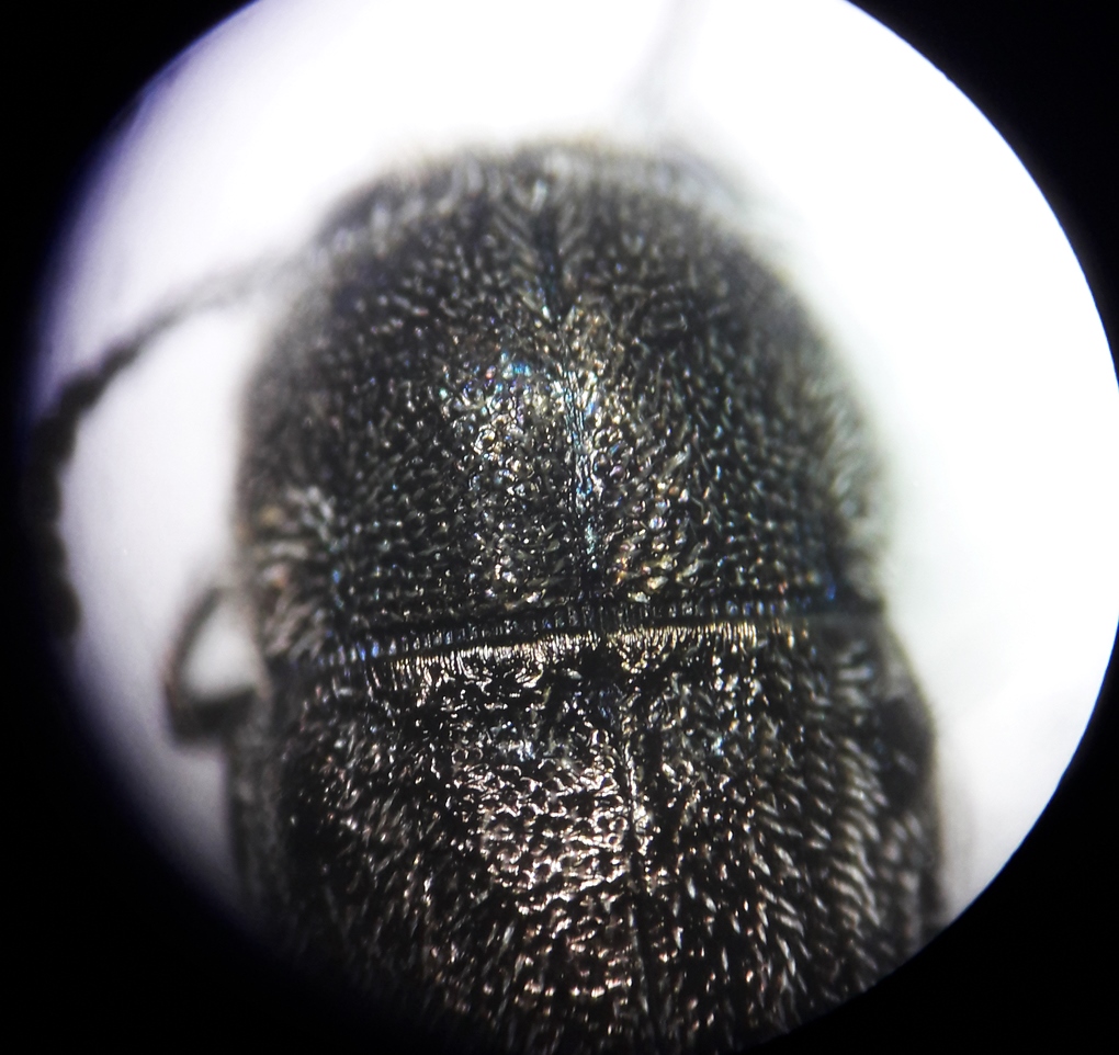 Prova a mettere l'esemplare sotto lo stereo ma entro un cilindretto di plastica traslucida, che dovrebbe diffondere un poco la luce riflessa dal pronoto e permetterti di stabilire quale polo della dicotomia sia quello giusto.