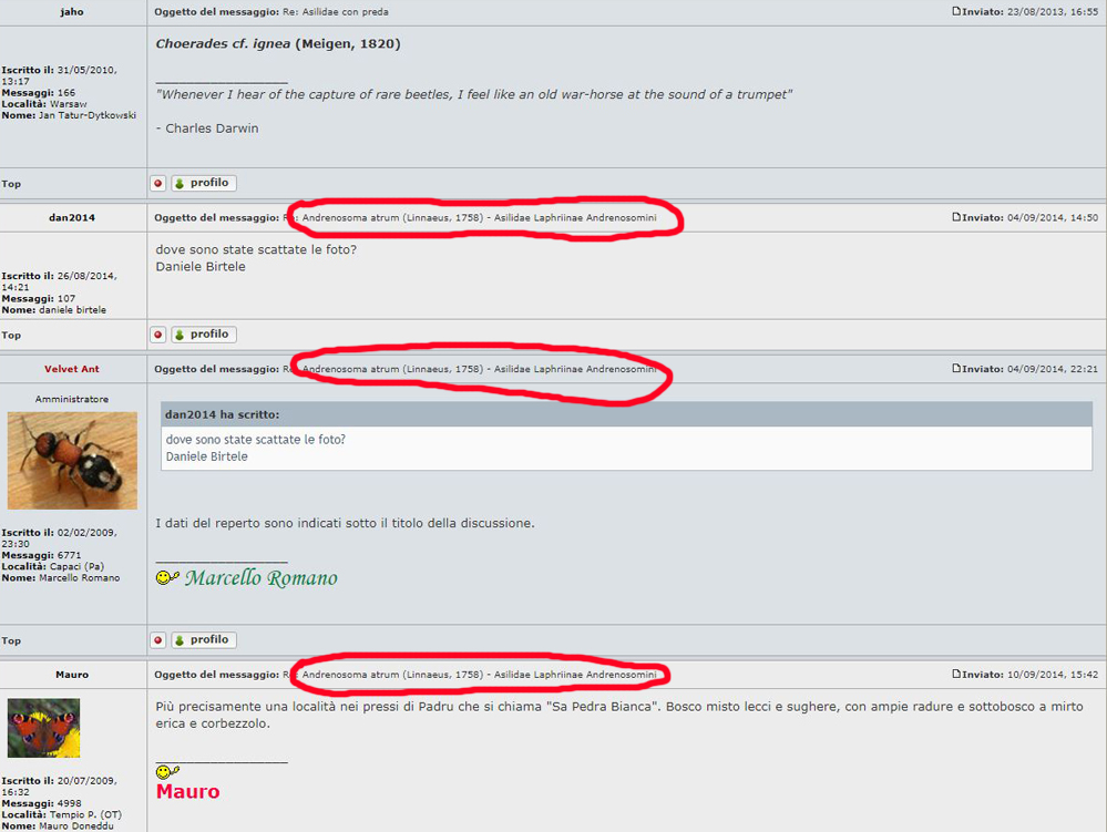 In realtà traccia della prima determinazione è rimasta, infatti come "oggetto del messaggio" delle risposte, aggiunte più di un anno dopo, da Daniele Birtele, Marcello Romano e da me, compare "Andrenosoma atrum (Linnaeus, 1758) - Asilidae Laphriinae Adrenosomini", come evidenziato nel ritaglio qui sotto