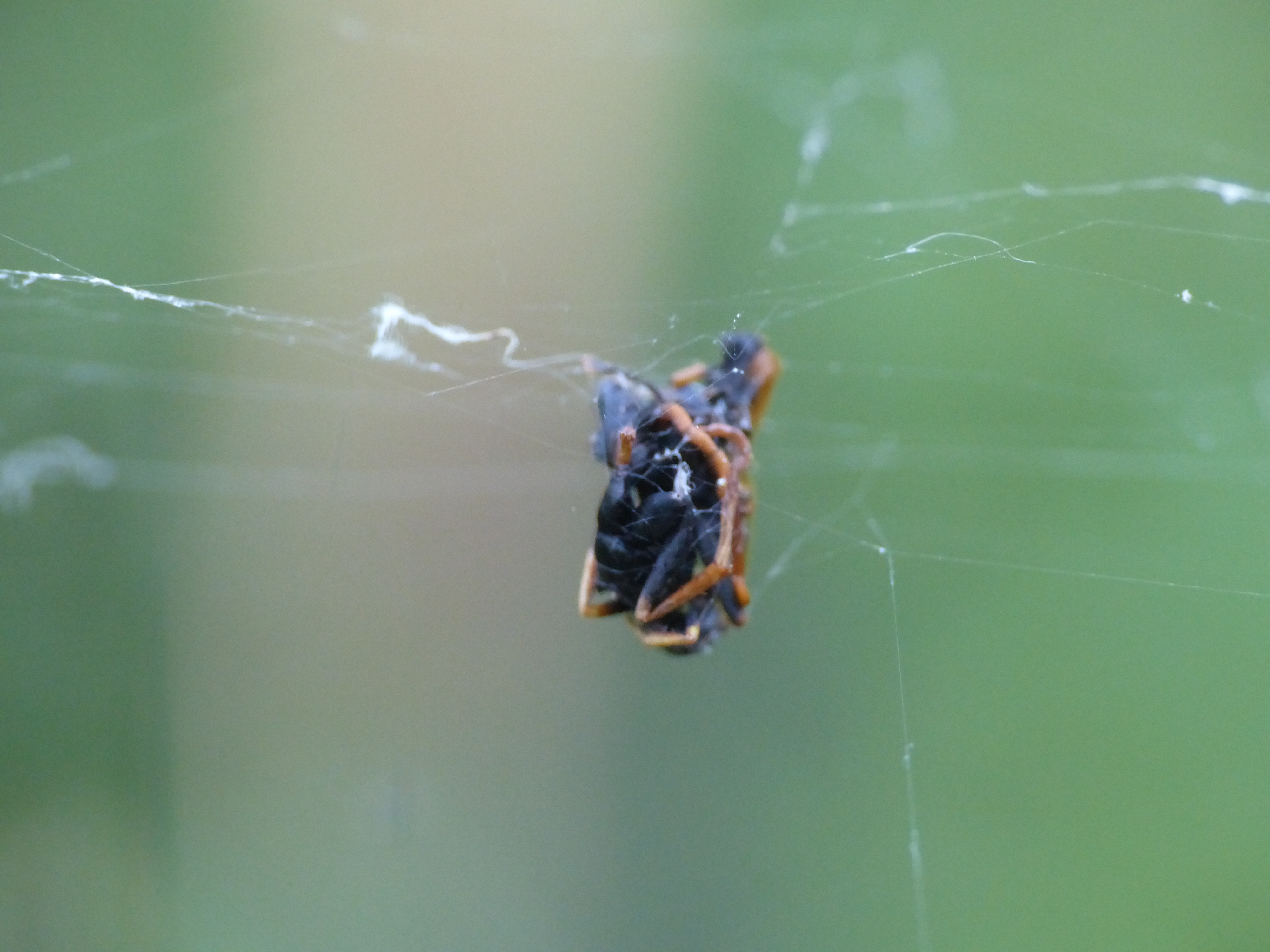 da ciò che ancora si vede, i resti nella ragnatela possono benissimo essere di Batozonellus lacerticida. forse avresti dovuto prelevarli per fotografarli con più cura a casa.