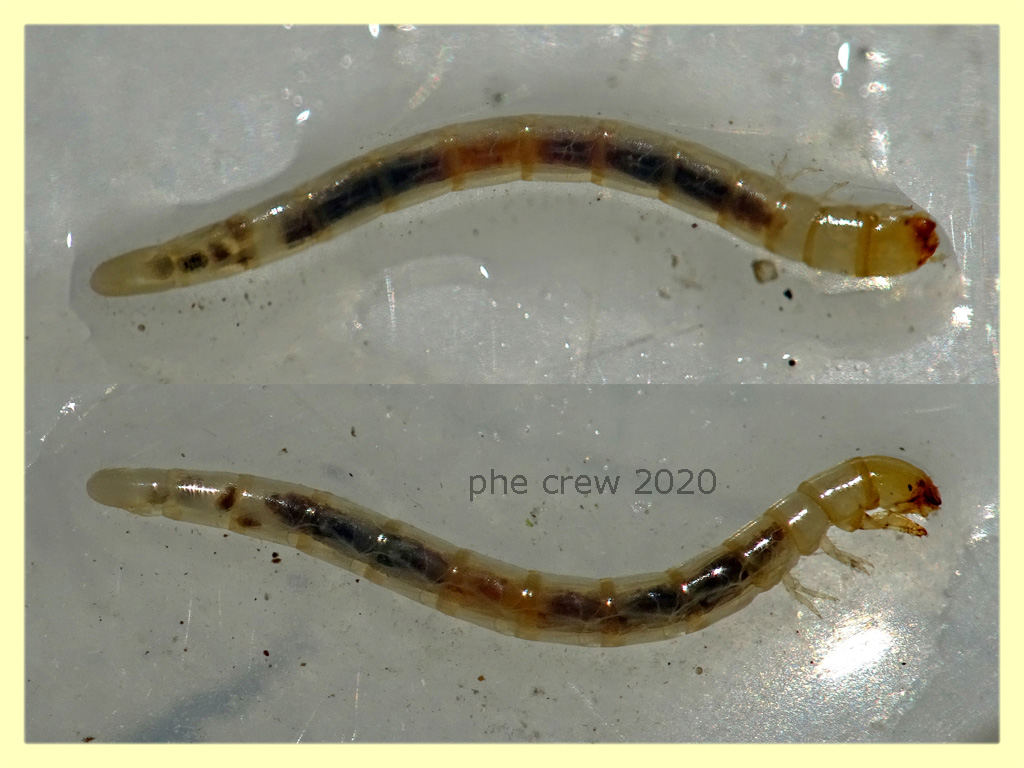...a primo impatto mi è venuto in mente il movimento di una larva di Zanzara, invece si può paragonare al movimento di una larva di Therevidae...in tutto e per tutto (mimetismo ?)...cammina anche all' indietro !!!...tranne che per la faccia, zampe e lunghezza come quella che ho trovato oggi....che è tipo il triplo. Le ho messe insieme nel terreno misto.... chissà se uscirà fuori qualcosa.