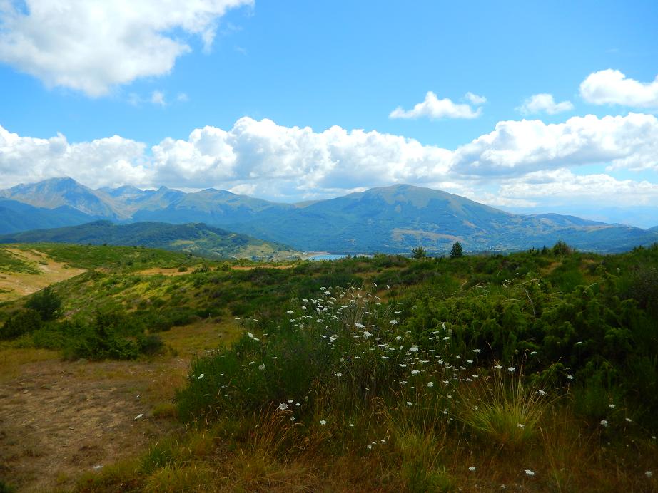 Sul sentiero c'erano tracce non recenti del passaggio di pecore e capre, e quindi anche mosche. Ma per fermarci abbiamo scelto una radura tra i cespugli un po' fuori dal sentiero, non c'erano escrementi, e invece c'era vento. A questo proposito, non so se il clima locale sia forse influenzato dalla relativa vicinanza del grande lago artificiale di Campotosto.