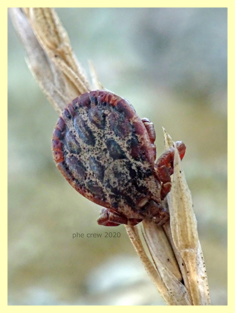 Per i macrocaratteri visibili in foto propendo per maschio di Dermacentor reticulatus (Fabricius, 1794), che rispetto a marginatus Sulzer, ha punti grossi e profondi sui festoni posteriori e sul dorso rari grossi punti.