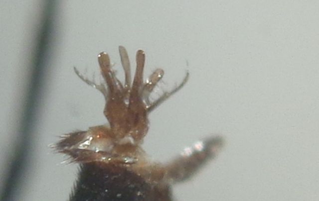 mi sembra dello stesso genere di questo viewtopic.php?f=11&t=94038 (con tre cellule submarginali) ma tutto nero e ben più piccolo, solo mm 5,2. Se vedo bene il genere, la sola specie sicula avente due cellule submarginali (vedi foto) sarebbe E. dubius van der Linden, 1827. Placca anale stretta e ad apice acuto-arrotondato con carena longitudinale, sternite 6 solo con fini peluzzi coricati. Propodeo con peluzzi argentei coricati e divergenti all'esterno. Palpi labiali brevi, ad articoli brevi e clavati. leg. M.Pavesi. Qualcuno può aiutarmi? Grazie.