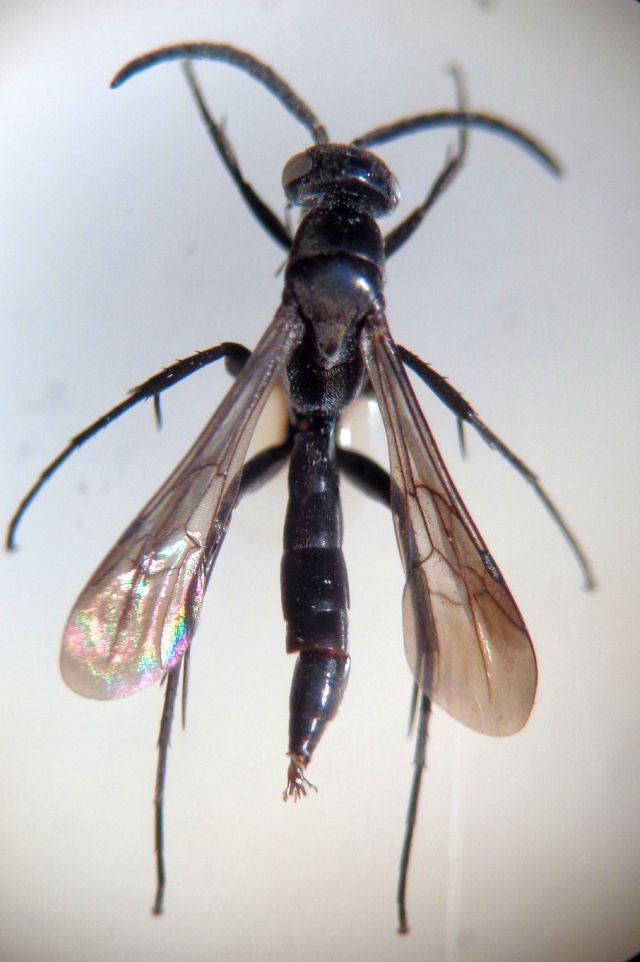 Grazie Andrea: l'esemplare ha le ali posteriori parzialmente agglutinate e faccio fatica ad evidenziare quanto chiedi anche se ci provo, ma posso vedere che nelle posteriori la venulazione è identica a questo viewtopic.php?f=11&t=94059 . Ho notato che forse Evagetes ha M e cu-a che si staccano nello stesso punto da M+Cu ma, come nel link, questo ha la posteriore con M che si distacca da M+Cu ben dopo la cu-a. Per cui rimando Andrea al link ove spiego come ritenga i due esemplari comunque due diverse specie per vari caratteri.