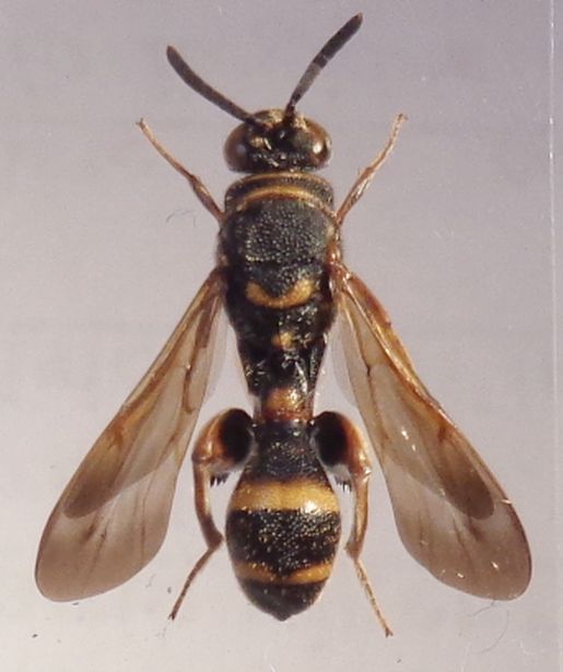 Alcuni caratteri: una sola carena sul pronoto, terebra che non raggiunge nemmeno la fine del 4° (se non conto male: il più largo) tergite, antenne interamente nere salvo forse l'apice che è molto debolmente bruniccio, metafemori con spine forti, ricurve, salvo quella più prossimale che è ridotta a un piccolo dentello e quella più distale che è più tozza e crenulata. Inoltre le macchie gialle sono leggermente aranciate, soprattutto nelle zampe. Dimensioni: 11mm.