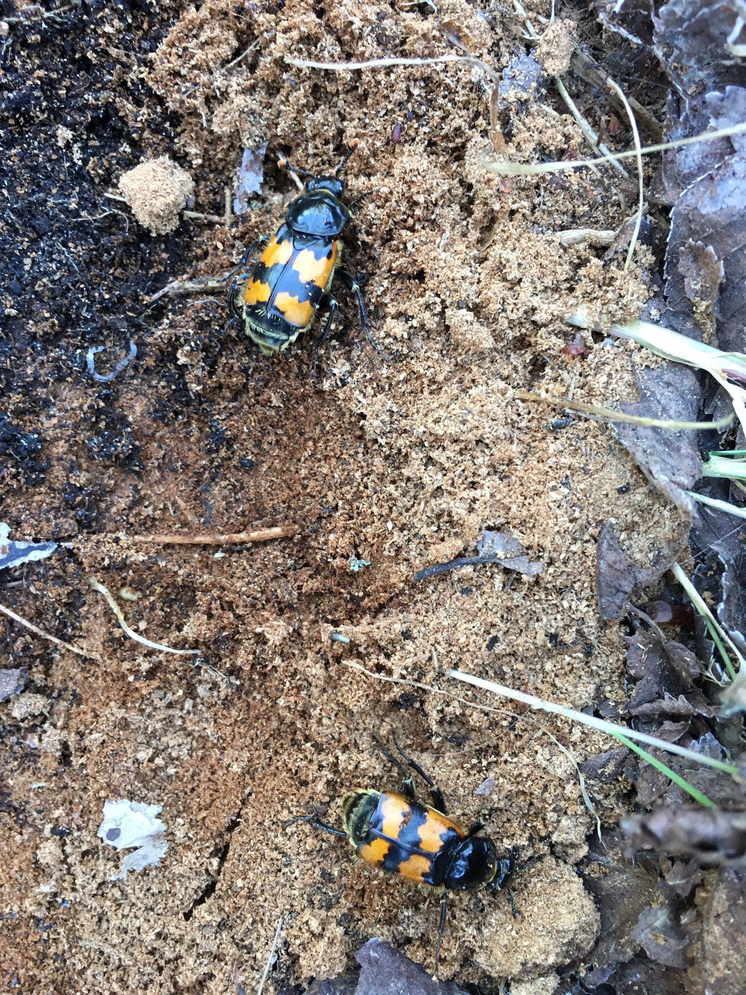 una coppia, maschio e femmina, di Nicrophorus vespillo trovata sotto un tronco... boh