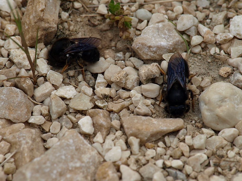 Tutte nere con quella capoccia direi che sono Megachile parietina che raccolgono la terra per la costruzione del nido.