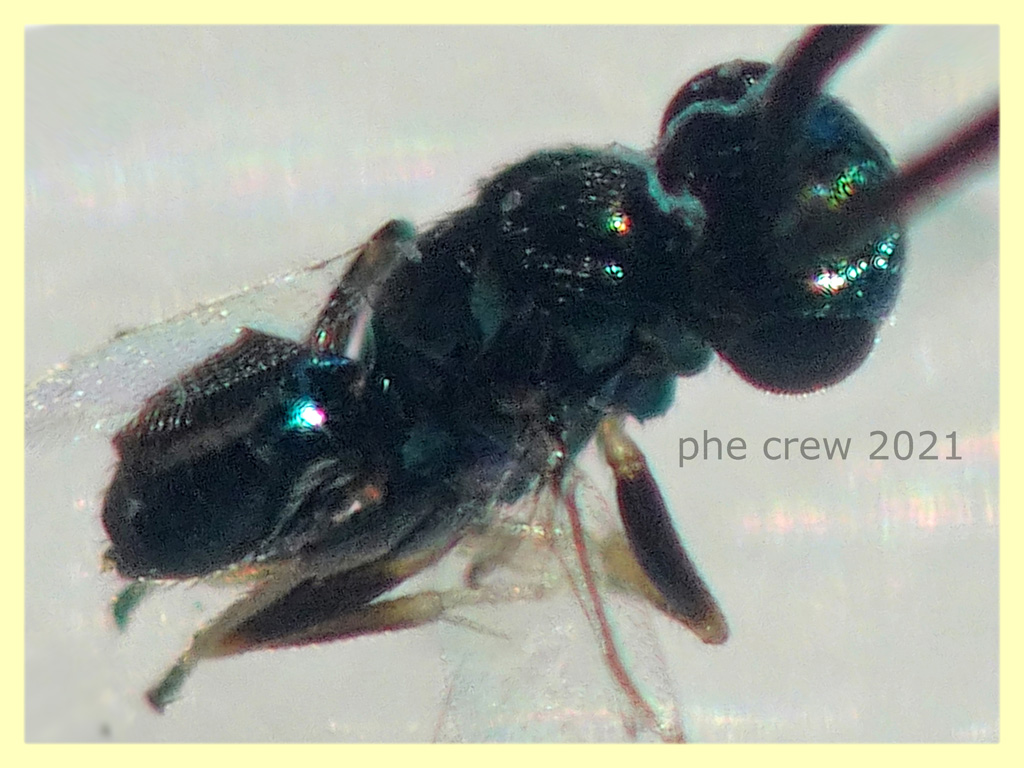 ... stavo leggendo un po' di post sui Pteromalidae qui sul forum e ho notato che anche nel mio esemplare ci sono le "palle"  come in questo post: viewtopic.php?f=553&t=34692&hilit=Pteromalidae.... dunque probabilmente è proprio un Pteromalidae....ah nella foto dell' ala ialina c'è da precisare che sotto si vede quella più piccola.