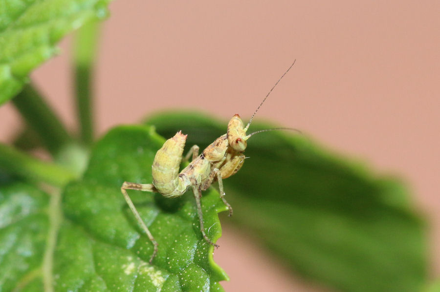 Il 4 luglio di quest'anno, a mia grande sorpresa, sopra una pianta di menta che si trovava quasi sotto la vecchia ooteca, ho scoperto di nuovo una neanide (già un po' cresciutella).