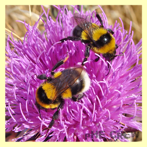 Due Bombi che fanno colazione con il nettare di un fiore di cardo.