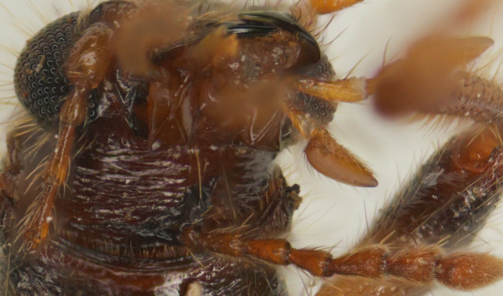Inizialmente pensavo si fosse staccata un'antenna e attaccata sotto al collo. Ho provato delicatamente a staccarla ma ho visto che faceva un'innaturale resistenza. Ad alto ingrandimento sotto il binoculare mi sono accorto della magagna. L'antenna "mozza" in realtà è completa, se così si può dire e l'altra antenna è nata sotto al collo.