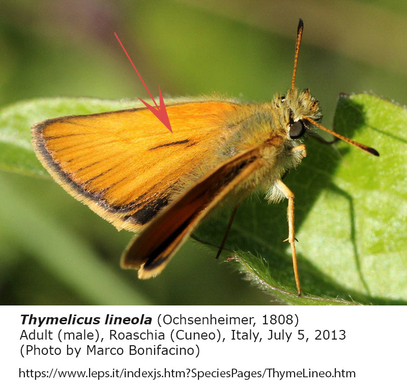 Oltre alla colorazione meno vivace, Thymelicus lineola è decisamente di un arancione forte, qui ci viene in aiuto l'area androconiale (quella lineetta scura al centro dell'ala anteriore) che ci indica che si tratta di un maschio e che nella lineola ha forma diversa, di seguito una foto per un confronto.