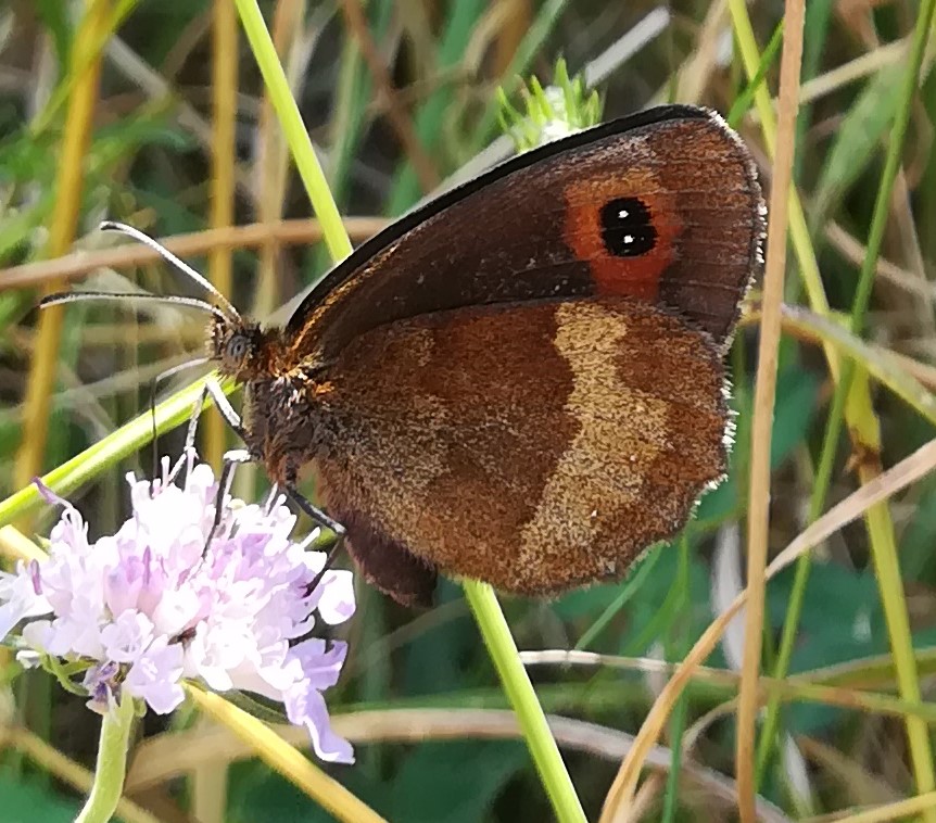 Lepidottero da identificare, probabilmente appartenente al genere Erebia sp. Dalle macchie sulla "pagina" superiore del primo paio di ali sembrerebbe più Erebia aethiops, ma dalla maculatura degli occhi sembrerebbe più Erebia neoridas. Inoltre, sulla "pagina" inferiore del secondo paio di ali vi sono 3 puntini bianchi visibili a malapena (in vicinanza del bordo esterno della fascia giallo-ocra), cosa che mi fa pensare ancora ad E. aethiops piuttosto che ad E. neoridas.