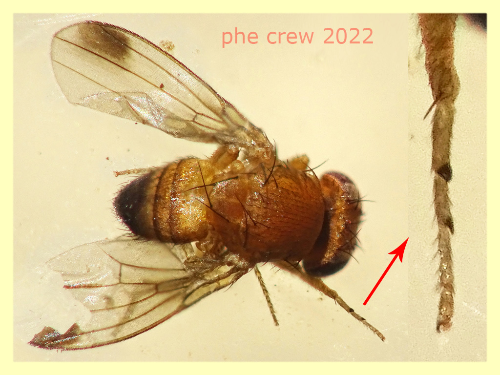 ...il 20.X.2022 ho ritirato delle trappole aeree con mix mela, banana e birra sempre ad Anzio ma in un altro prato;….di queste Drosophila sp. ne ho trovate una 30 ina. Il problema e': dato che c' erano alcuni maschi con spot neri sulle ali nel gruppetto (in foto solo una parte con solo un maschio) mi sono convinto essere tutte D. suzukii….ma poi...mi son detto...non e' che conviva anche con D. melanogaster ? Ho fotografato l' ovopositore dell' unica femmina che era messa meglio e anche l' ala….ma non sono riuscito a trovare sul web la foto dell' ovopositore della D. melanogaster...dunque non so come e' fatto, questo fotografato sembra proprio della D. suzukii....o no ?