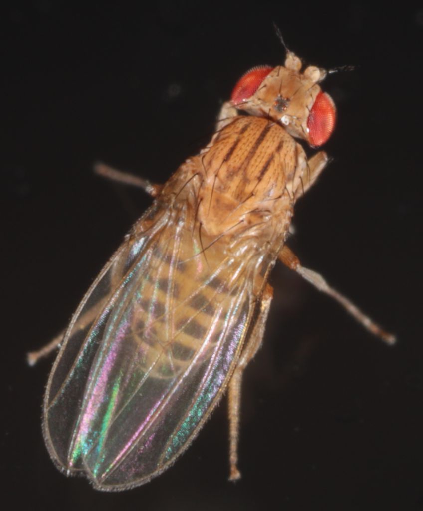 In queste settimane la casa è piena di drosofile. Per lo più sono D. melanogaster, ma ogni tanto se ne vede qualche altra. Questa, caratterizzata dalle tre strisce più scure del torace e dalla forma delle macchie scure sui tergiti, è una specie proveniente dal nord america ma ora diffusa in tutto il mondo. Lunghezza circa 2,5 mm.